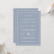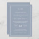 Faire-part de mariage simple avec un design moderne et élégant avec votre monogramme à deux lettres en haut, une mise en page audacieuse et vos détails entourés d'une fine bordure. Tout le texte est en blanc sur un arrière - plan bleu poussiéreux. Les polices et les couleurs arrière - plans peuvent être changées en n'importe quelle couleur. Un design chic et design qui conviendra à un couple minimaliste.