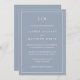 Simple faire-part de mariage bleu poussiéreux avec un design moderne mais élégant avec votre monogramme à deux lettres en haut et vos détails entourés d'une fine bordure. Les polices et les couleurs arrière - plans peuvent être changées en n'importe quelle couleur en cliquant sur le bouton "personnaliser". Un design chic et design qui conviendra à un couple minimaliste.