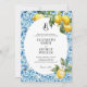 L'hôtel Desigbn présente un design élégant et dynamique, avec des motifs de style méditerranéen bleu entourant un ovale blanc central. Le monogramme en haut apporte une touche personnalisée, tandis que les illustrations au citron apportent une touche fraîche et estivale. Les détails de l'invitation sont présentés dans une police classique et sophistiquée, invitant les clients à un mariage dans un emplacement pittoresque. L'esthétique générale allie éléments traditionnels et lumineux, le rendant à la fois intemporel et vivant.