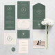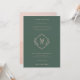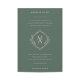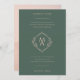 Ce faire-part de mariage vert à feuillage persistant foncé est doté d'un monogramme moderne en forme de losange au centre, dont les initiales de la mariée et du marié sont bien visibles. Le monogramme est entouré d'une typographie classique dans un rose pêche léger, ajoutant une touche d'élégance au design. Des détails floraux délicats viennent embellir l'invitation, lui conférant une atmosphère romantique et intemporelle. L'ensemble est sophistiqué et unique, ce qui en fait un choix parfait pour une mariage élégante et sophistiquée.