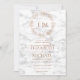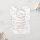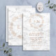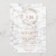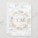 Un faire-part de mariage monogramme moderne avec une couronne feuillue en feuille de cuivre autour du monogramme, qui se trouve en haut de l'invitation, et aussi à l'envers. Sur un arrière - plan de faux marbre blanc, le texte est rendu dans un ton de cuivre assorti. Copyright Invitations élégants, tous droits réservés.