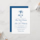 Invitation vos invités pour vous aider à célébrer votre journée spéciale avec cette élégante invitation avec typographie de script moderne, vos initiales et un palmier artistique. Un arrière - plan bleu coordonné est placé au dos de la carte. Idéal pour une plage ou un espace mariage extérieur.