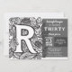 Ce design spécial présente des lignes de tatouage noir et blanc avec un monogramme audacieux "R" entouré de pivoines, de roses, de tournesols et d'autres fleurs. Si vous n'êtes pas un "R" cet arrière - plan est disponible dans de nombreuses initiales monographiques. Célébrez un anniversaire marquant avec ce modèle facile à mettre à jour. Il vous suffit de remplir le nom, l'âge, la date, l'heure, l'emplacement de la partie et les notes de la RSVP ou d'autres renseignements.