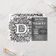 Ce design spécial présente des lignes de tatouage noir et blanc avec un monogramme audacieux "D" entouré de pivoines, de roses, de tournesols et d'autres fleurs. Si vous n'êtes pas un "D" cet arrière - plan est disponible dans de nombreuses initiales monographiques. Célébrez un anniversaire marquant avec ce modèle facile à mettre à jour. Il vous suffit de remplir le nom, l'âge, la date, l'heure, l'emplacement de la partie et les notes de la RSVP ou d'autres renseignements.