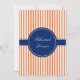 L'arrière - plan est agrémenté d'un motif à rayures orange et blanches alternant. Le design présente également les initiales de la mariée et du marié séparées par un coeur orange. Un élégant motif rayé et au milieu un cercle bleu royal où ajouter le texte de votre invitation. Répétition des invitations au dîner.