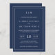 Faire-part de mariage simple avec un design moderne et élégant avec votre monogramme à deux lettres en haut, une mise en page audacieuse et vos détails entourés d'une fine bordure. Tout le texte est en blanc sur un arrière - plan bleu marine. Les polices et les couleurs arrière - plans peuvent être changées en n'importe quelle couleur. Un design chic et design qui conviendra à un couple minimaliste.