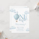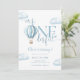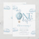 Cette invitation à la première fête d'anniversaire charmante présente une montgolfière bleue mignonne et des nuages, ainsi qu'une typographie élégante. Conçu par Thisisnotme©