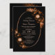 Une élégante faire-part de mariage noire avec un agencement rustique orangé rustique et fleuri sur un cadre ovale. Les détails de la cérémonie et de l'adresse de réception ont été inclus dans cette invitation.