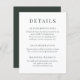 Complete your wedding suite with this moody forest green details card, featuring rich dark green tones and elegant minimalist typography. Perfect for sophisticated, modern, woodland, rustic, or nature-inspired weddings, this design provides space for accommodations, directions, reception information, and special notes. The refined layout pairs beautifully with any moody green or forest-themed wedding invitation. Fully customizable and print-ready, offering a polished finishing touch to your stationery set.