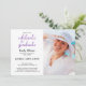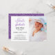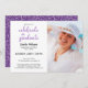Envoyez des invitations de remise de diplôme personnalisables, modernes et cool pour la célébration de votre diplômé. Remplacez la photo et le texte d'exemple par les vôtres pour le rendre unique. Personnalisez-le pour n'importe quel diplômé : lycée, université, école supérieure, faculté de droit, faculté de médecine, école professionnelle. L'invitation présente les mots "célébrez le diplômé" dans une police de caractères cursive aquarelle violette sur fond blanc. Les couleurs de texte noir peuvent être modifiées en cliquant sur le bouton "Personnaliser". Au dos, un motif décoratif peint de courbes blanches entrelacées se rencontrent et divergent sur un fond violet.