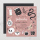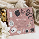 Planifiez votre soirée d'anniversaire de quinceanera à thème Halloween avec ces invitations chic éffrayantes dans une palette de couleurs inspirées de la nature boho. Le design présente des illustrations d'un serpent, d'un livre d'épices, d'une bougie, d'un pot, d'un crâne, de cartes tarot et d'une potion entourant les détails de la célébration de la quinceanera.