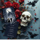 The composition is filled with romantic and gothic details that evoke an enigmatic atmosphere and a timeless love story that seems to defy the darkness of the forest and the mystery of the distant castle. The result is a perfect design for couples who wish to celebrate a Halloween themed wedding or a celebration with a dark magical fantasy style.