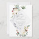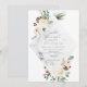 Ce design de fête de vacances présente des fleurs rouges et blanches contre un arrière - plan neutre avec feuillage, branches et baies et une texture gris brumeux.