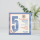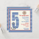 Nautique bleu, voilier blanc invitations à la 5e fête d’anniversaire, avec le numéro 5 à motif bleu, rayures blanches, ancre et roue du capitaine. Il y a une bordure rayée bleue et blanche autour. Ce design mignon a une sensation vintage. Convient aux enfants garçons et filles. A l'arrière, il y a un joli voilier. Couleur : bleu, rouge, marron, gris. Quelques éléments artistiques d'Alice Smith.