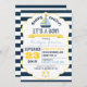La marine et la rayure blanche impriment l'arrière - plan avec la carte nautique d'invitation de baby shower de garçon de voilier et de flotteur de sauveteur.