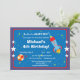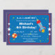 Cette amusante invitation à la fête d'anniversaire comprend un vaisseau-fusée qui explose et une planète à pots de polka sur un arrière - plan spatial bleu avec des étoiles. Entièrement personnalisable.