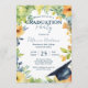 Celebrate the graduate's academic achievement with this elegant, artistic design. This invitation features a hand-painted watercolor border of meadow flowers in shades of mustard yellow, soft orange, and cream, accented by sage green and dusty blue foliage. A classic navy blue graduation cap (mortarboard) rests in the corner, tying the botanical theme to the scholastic milestone.