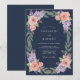This design features a deep navy blue background that provides a dramatic contrast for soft peach roses and lavender lilac clusters. Verdant evergreen sprigs and pine needles add a seasonal touch to the lush botanical arrangement. The mood is sophisticated and formal, perfect for an evening event. A palette of midnight blue, coral, and muted purple creates a striking aesthetic.