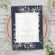 An elegant personalized celebration of life remembrance invitation featuring botanical watercolor greenery foliage on a navy blue background. Designed by Thisisnotme©