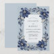 This design showcases deep navy blue and dusty blue watercolor anemones with dark centers. Delicate leafy stems and foliage surround the central area against a soft, textured blue background. The cool color palette and artistic floral arrangement create a serene and sophisticated atmosphere suitable for a formal winter or early spring event.
