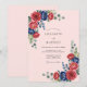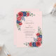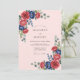 Vibrant red roses and deep navy blue peonies create a bold botanical display against a delicate blush pink background. Soft sage green eucalyptus foliage weaves through the floral arrangements, adding a touch of natural elegance. The watercolor textures provide a classic and romantic aesthetic suitable for any season.