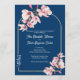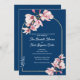 Navy Blue Pink Magnolia Elegant Floral Wedding Invitation with Gold Arch .