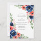 This design features a vibrant watercolor arrangement of navy blue and coral blooms with delicate green foliage. The artistic floral accents create a romantic and lively atmosphere. Perfect for a naturalistic and elegant affair.