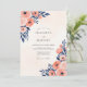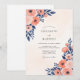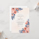 This design features a sophisticated contrast between deep navy foliage and soft coral roses. A delicate watercolor wash in a pale peach hue provides a romantic backdrop for the lush botanical elements. Elegant floral clusters adorn the edges, creating a balanced and airy aesthetic perfect for a seasonal event.