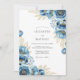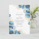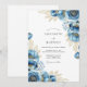 A captivating arrangement of deep blue and sapphire blossoms with delicate golden foliage graces this design. Evoking a sense of romantic sophistication, the floral imagery creates an enchanting and luxurious atmosphere. This artful composition is perfect for a memorable occasion.