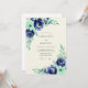 A watercolor floral arrangement in deep navy blues and refreshing mint greens graces this design. The artistic composition evokes a sense of natural elegance and a tranquil, romantic atmosphere. Accents of light greenery complement the rich blooms, creating a visually harmonious presentation perfect for a special occasion.