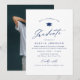 Navy blue and white simple graduation invitation with modern hand written calligraphy and grad cap, personalized photo on the back, simple and unique. Custom it with your own photo and grad party information.