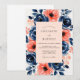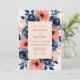 This design features a lush arrangement of painterly navy blue roses and vibrant coral anemones. The watercolor blooms create a bold yet romantic atmosphere, perfect for a sophisticated seasonal event. Deep blue foliage and soft blush accents complement the striking floral motif, offering a modern artistic aesthetic.