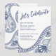 Invitez vos invités à votre célébration de mariage à l'aide de ces cartes de invitation élégantes avec un motif marine sur fond blanc. Dans le design que j'ai utilisé, une police manuscrite moderne et décontractée crée une superposition de typographie graphique avec la mention "Célébrons". Le long du bas, j'ai placé le bord d'une seule image marine agrandie en forme de paisley. Le verso présente un groupe de trois versions supplémentaires du même graphique. Remplissez les espaces vides du modèle avec vos informations pour personnaliser le design. Toutes les couches ont été laissées déverrouillées afin que vous puissiez cliquer pour personnaliser davantage et repositionner le texte ou même changer la taille ou les polices. Faites pivoter ou redimensionnez les motifs paisley comme bon vous semble. La couleur de fond a été laissée blanche, mais celle-ci est également modifiable. N'hésitez pas
