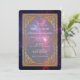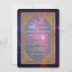 Une invitation de mariage avec une image fantaisiste de l'espace cosmique avec des étoiles et une nébuleuse vaporeuse. Un cadre décoratif doré est superposé par-dessus.