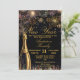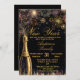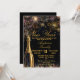 New Year's Eve Party Invitation featuring a bottle of bubbly and sparkling gold fireworks on a black background and gold text. Elegant and glam Invite for a New Year Celebration or get together. All text can be amended as needed - more text can be added on the reverse or delete the text box if not needed.