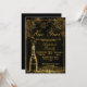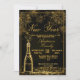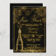 New Year's Eve Party Invitation featuring a bottle of bubbly and sparkling gold fireworks on a black background and gold text. Elegant and glam Invite for a New Year Celebration or get together. All text can be amended as needed - more text can be added on the reverse or delete the text box if not needed.