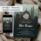 Set a peaceful and atmospheric mood with this deep-toned Iftar invitation. The design features a majestic mosque silhouette against a misty night sky with traditional star patterns. Perfect for evening gatherings. This template is ready for instant download or as a high-resolution printable.