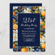 Invitation de 21e anniversaire décorée d'oranges et de fleurs blanches sur un arrière - plan bleu marine. Ces invitations peuvent être customisées pour n'importe quel âge. Contactez-moi pour obtenir de l'aide sur vos personnalisations ou pour demander des produits Zazzle correspondants ou coordonnés supplémentaires pour votre célébration.