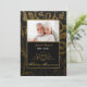 Élégante invitation d'anniversaire de mariage de cinquante ans sur damas floral noir et or avec une bordure accentuée d'or pour célébrer cette date spéciale de cinquante années passées ensemble. Téléchargez une photo pour remplacer l'espace réservé. Personnalisez le texte du recto et du verso de l'invitation avec l'heure, la date, le lieu et d'autres informations.