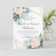 Cartes d'invitation de mariage anniversaire aquarelle verdure, cadre géométrique or et pivoines roses