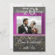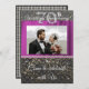 Carton d'invitation noir chic et platine avec soie rose fuchsia présentant la photographie du couple.