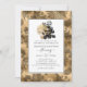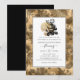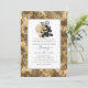 Carton d'invitation de mariage avec des roses noires et or et un fond damassé vintage à effet de foil brillant.