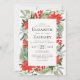 Ce design festif présente un cadre de verdure et de fleurs de vacances, notamment des poinsettias rouges et blanches, des boughs de pin vert et des sprigs d'eucalyptus. Le texte noir apparaît sur un rectangle pâle et blush. Idéal pour un mariage à thème hiver ou Noël. Le dos de la carte est assorti d'une nuance de rouge solide.