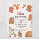 . L'invitation à un échange de biscuits a un homme en pain d'épices, une maison en pain d'épices et un biscuit de Noël avec un bas en pain d'épices.Les mots "Christmas Cookie Swap" sont écrits dans une grande et magnifique écriture manuscrite. Vous avez assez de contenu modèle pour véhiculer le concept de votre parti.