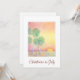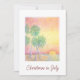 Noël en Juillet invitation de fête avec une typographie script et design de plage tropicale avec palmiers au coucher du soleil. Avec des lettres personnalisables en rouge, vous pouvez ajouter vos propres informations. Une façon festive d'ajouter une touche d'été à votre fête de vacances.