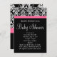 Élégant arrière - plan noir avec accent fuchsia magenta rose chaud et motif damassé noir et blanc. Un accent damassé frais, propre et élégant, et une bande d'accent horizontale colorée. Customisez en ligne avec les détails de votre baby shower fille.