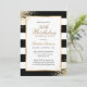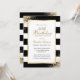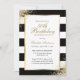 Élégante invitation d'anniversaire en noir, blanc et or avec détails d'anniversaire dans un cadre doré contre un arrière - plan noir et blanc orné de confettis dorés. Invitation d'anniversaire en noir et blanc. Invitation d'anniversaire en noir et or. Personnalisez facilement ce modèle à n'importe quelle fête d'anniversaire.