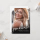 Faire-part de remise de diplôme et invitation à la fête minimaliste simple. Le devant présente une photo pleine page avec un dégradé noir en bas, surmonté de texte blanc pour un look élégant et moderne. "Diplômé" est affiché dans une écriture manuscrite élégante, avec le nom du diplômé, "Promotion 2025" et le nom de l'école en dessous, dans des polices blanches classiques, assurant un design audacieux et lisible.