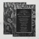 Élégante invitation d'anniversaire de mariage de vingt-cinquième sur damassé floral noir et argent avec une bordure d'accent argenté pour célébrer cette date spéciale de vingt-cinq ans ensemble. Personnalisez le devant de l'invitation avec l'heure, la date, le lieu et d'autres informations.