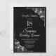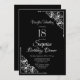 Une invitation à dîner Surprise 18e anniversaire en noir et blanc avec des coins diagonaux en dentelle ornée pour encadrer le texte blanc.